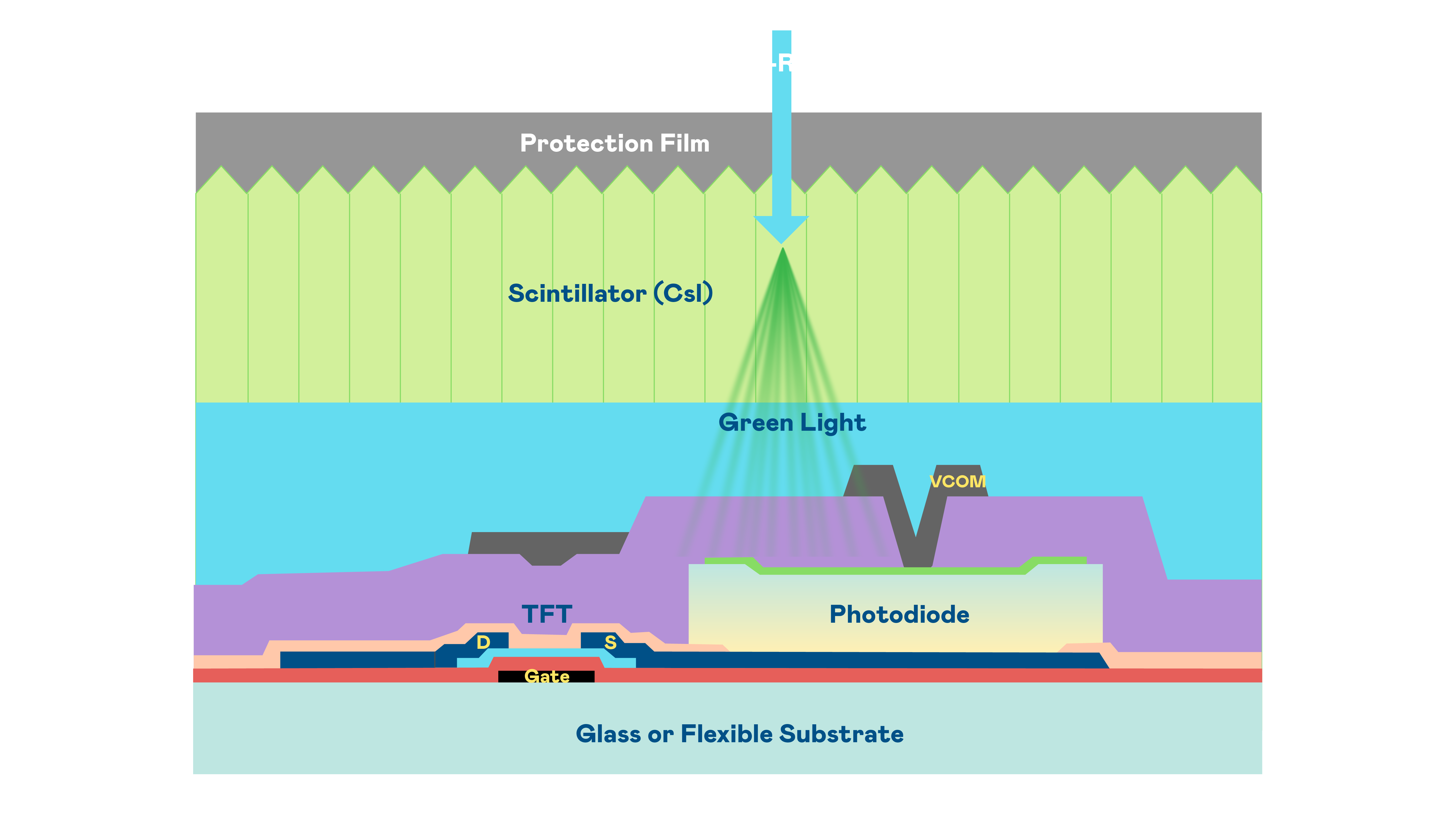 人生就是搏的X光影像感測陣列使用薄膜電晶體 (TFT) 作為每個像素的讀取開關,搭配光電二極體(Photodiode)的光電轉換元件,用以感測X光影像訊號。